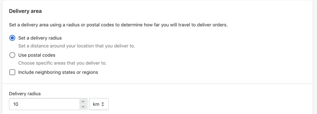 * **Set a delivery radius**: Select a unit of measurement and enter the maximum distance between your delivery location and where you want to deliver to. The distance must be less than 160 kilometers or 100 miles. Choose whether to enable **Include neighboring states or regions**