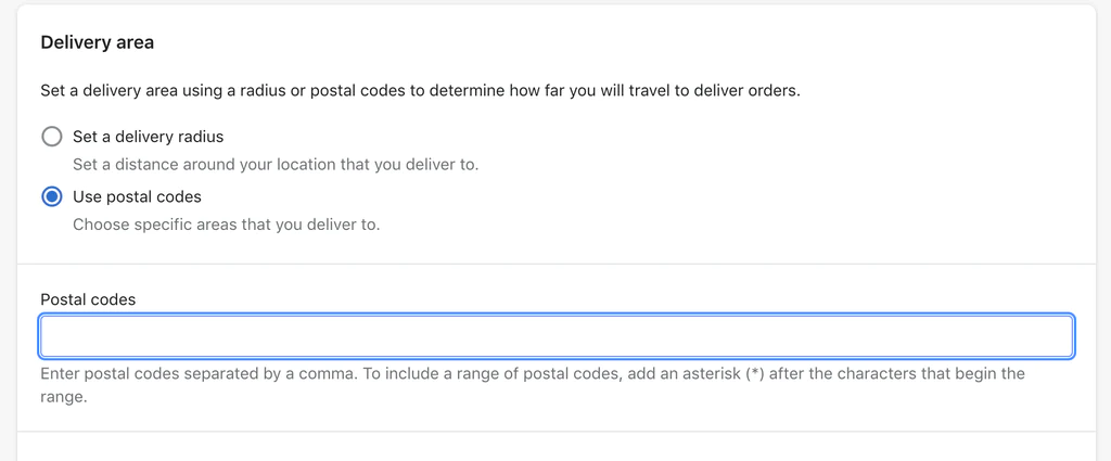 * **Use postal codes**: Enter a list of postal codes (up to a maximum of 3,000 characters) that you want to deliver to, separated by a comma and a space. To include a group of postal codes, add either an asterisk or a space after the initial characters to indicate a range of postal codes.