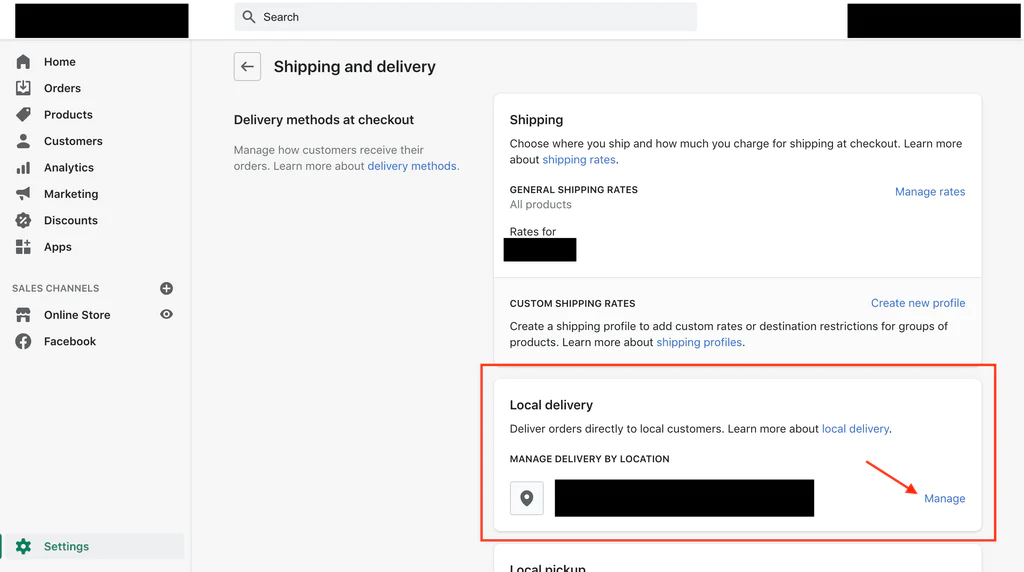 2. In the **Local delivery** section, click **Manage** next to the location where you want to offer local delivery. If you have several locations, then click **Show more** to display all your locations